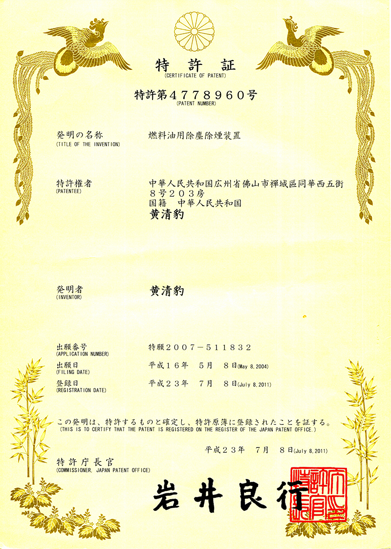 美国专利证书1:一种除燃油烟尘设备(人居-2011) 日本专利证书2:一种除燃油烟尘设备(人居-2011)